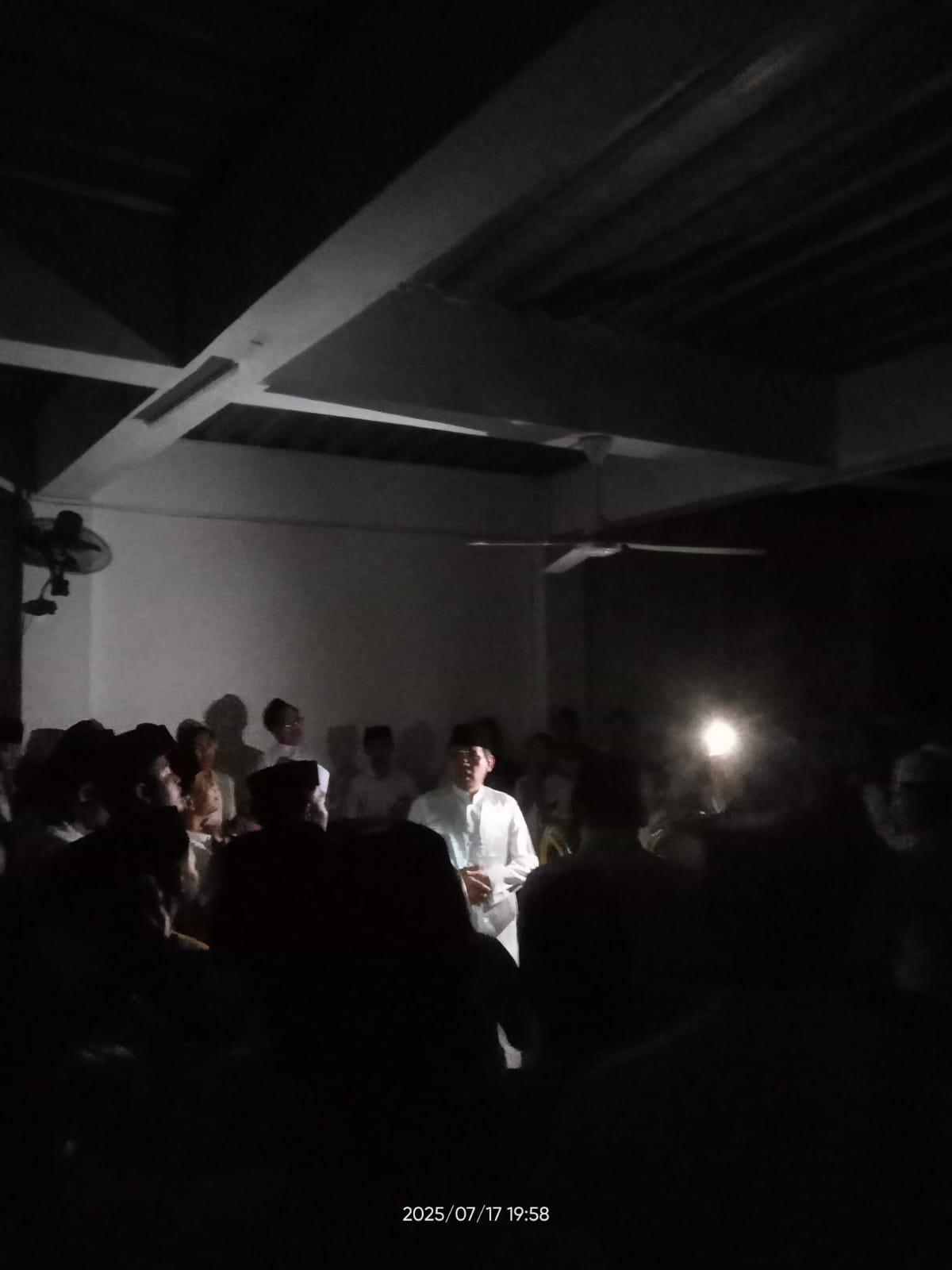 Ini sudah menjadi rutinitas setiap minggu. Namun pada malam Jum;at ini, 17 Juli 2025, auranya terasa beda. Hal ini karena tiba-tiba lampu padam. Sekitar Jam 19.50, suasana menjadi gelap. Juga gulita. Hal ini tidak hanya terjadi di PP Mahasina saja, melainkan juga di seluruh kampung Kemang, mungkin juga di sebagian wilayah lain di Pondok Gede, Kota Bekasi.